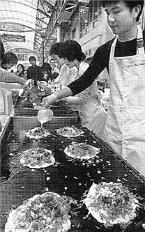 味も店も凝縮 神戸・長田を大阪、広島と並べるお好み焼きの「聖地」にしようと、神戸市長田区の六間道商店街で30日、まちおこし団体がシンポジウム「震災のまちから日本一のお好み焼きのまちへ」を開いた。特設ステージで大阪、広島、長田の代表的なお好み焼きをつくって市民ら100人に食べ比べてもらい、「両雄」に引けを取らない地元の味をアピールした=写真。 主催した「神戸ながたTMO」によると、JR新長田駅を中心にした半径500メートルに60軒を超えるお好み焼き店があり、「集積率は全国一」という。特徴はクレープのような薄い生地。ネギと牛スジをふんだんに入れ、辛めのソースで仕上げる。神戸ながたTMOの森崎清登・商業活性事業部長は「長田焼きこそ原点の味。知名度を上げ、お好み焼きで人を呼べるまちにしたい」。 |