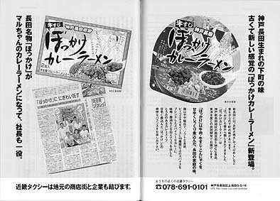 | 創刊号から引き続いて今回も弊社の広告を入れていただきました。今回は神戸・長田発の新しい味(商品)の紹介です。弊社社長の森崎もパッケージに登場し一役買っております。 |
