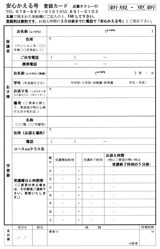 お申込みされる場合は、先にご連絡を頂ければ登録カード用紙をファックスでお送りします。その用紙に必要事項をご記入の上、ご返送ください。