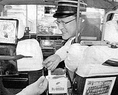 ![]() 募金した客に赤い羽根を手渡す近畿タクシーの運転手 |