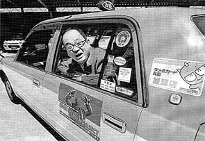 ![]() 「私はまちの『アッシー君』とタクシーから顔を出す森崎さん =近畿タクシー本社で |