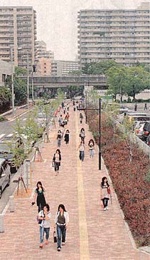 ![]() 駅から歩いてキャンパスへ向かう学生たち。 昼間の人口は増えたが…=中央区港島中町 |