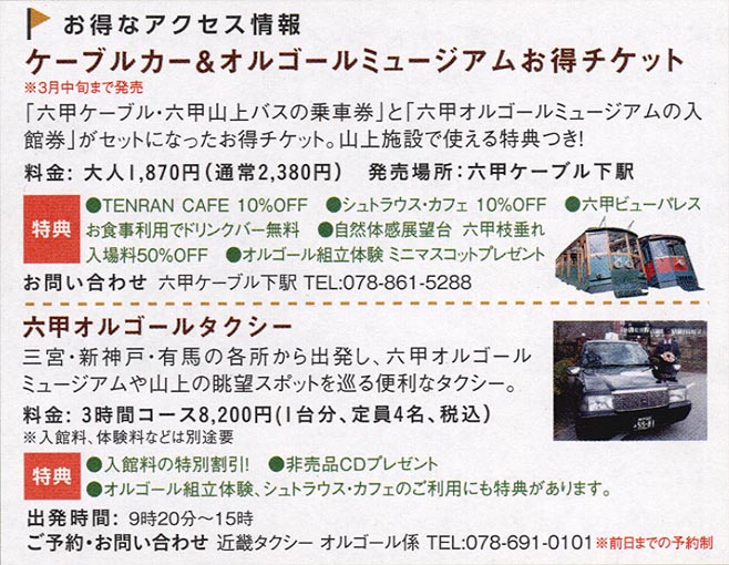 以下のお得なアクセス情報は、パンフレット「ケーブルカーで行こう!六甲山 Winter Selection」(発行:阪急阪神東宝グループ)より、一部抜粋して転載しています。