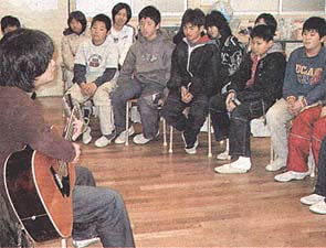 総合学習の一環。6年生21人を対象に、10日から23日まで5時間を設けた。 この日は、最初に元タレントで「神戸長田TMO」の田中雅久さん(30)が「震災で死んでもおかしくなかった命。今はまちおこしに取り組んでいる。長田に住むみんなも、夢に向かって力強く生きてほしい」と訴えた。 ガガガSP(スペシャル)の山本聡さん(22)は、飛び入りで参加。「音楽でも何でも一生懸命やれば楽しい」と話し掛け、ギターの弾き語りも披露した。 最後に、近畿タクシーの森崎清登社長(50)が登場。「『おもろいなあ』という企画を考え、お客さんに喜んでもらうのが夢。遊び心を持って、普段の暮らしの中のことから大切にしてほしい」と話した。児童らは「夢の大切さが分かった」「私も人のために頑張りたい」と感想を話していた。 |