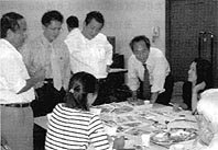 | 主催者として、実のところ、告知期間も短く、当初、参加者の数が気になるところでしたが、ふたを開けると、用意していたパイプ椅子が足らずに、受け付け担当の会員が慌てるほどの盛況で終えることができました。主催者発表は目標の150%、全日程200人を超える参加となりました。 講師の皆さんには塾の終了後、若干時間をいただき、会場の隅にテーブルを寄せ合い、茶話会をセット。質疑応答の硬さは無くして、参加者と講師が和める場づくりです。ファシリティ役の会員がつい熱がはいって話し過ぎたというハプニングはあったものの、毎回交わされる専門的な話題のやりとりに会員のみんなは大いに触発されました。 ひょっとして、この時、長田区ユニバーサルデザイン研究会は4年目にして、大きな化学変化を起こしたのかも知れません。それは、チームが事業化を考え始めたことです。 「つながった区ユニバーサルデザイン研究会」を一緒に、やりませんか? トラの巻も、化学変化を起こして、突然、勧誘チラシになってきます。 事業化に向けたプロジェクトが始まります。職業・立場などにとらわれることなく、皆さん自身が興味のある活動に参加しませんか?「人」とつながると、自分が忘れていた能力を引き出してくれる場に出くわすことがあります。そんな楽しいオマケがつく研究会に、ようこそ、つながって下さい。 2004年11月3日(祝日)に第4回長田発こうべユニバーサルデザイン・フェアがJR新長田駅前で開催されます。その会場で、下記のプロジェクトの進捗報告があります。つながることに、まだ、迷われている方は、是非、お立ち寄りの上、現場で、つながって下さい。 (1)工務店経営の会員が「以前から暖めていたプランを始めたい。」と例会で発表した。名づけて、「すまいの応援団」。医師、ケアマネージャー、建築士、福祉住環境コーディネーター、電気店、福祉用具専門相談員などでチームを作りました。住宅改修の専門家集団が会員の皆さんで出来上がりです。高齢者の方がお客様。「暮らしの中で不自由をし続けていませんか?ちょっとした工夫、改善で、快適になります。」と声がけをします。安全なすまいづくりをPRします。施工の請け負いも視野に入れています。お客様は、地域の「人」。不便のリクエストがそのまま、すまいの応援団の応援になります。地域の不便のデータベースづくりも狙いのひとつです。 (2)商工会議所の地元支部が、UDの街づくりの土壌を活かした研究会の活動に注目。企業と企業のつながりを実現する場として、研究会が期待されています。UD商品の企画、試作品の評価を会員が担い、改良された商品を会員の商店街で実験的に展示、販売し、お客様の声をフィードバックする仕組みを検討しています。 (3)「みる」チームと「かぐ」チーム合同で、地域のUDなスポットをつないでゆく「UDながた百選」観光コースを開発中です。最近では、学校、駅、商業ビルなど新築の建物が増えてきました。それらもUDなスポットと言えますが、この街では、ありふれた風景の中に、さりげなく百選はあります。「人」と出会うことで、見えてくるUD。それを会員のネットワークで選びます。来訪者が「人」につながりながら、街歩きをするという新しい都市型観光です。ある意味、ミステリー・ツアーです。来訪者には、自らが言葉を交わしながら、歩いた経路と出会ったスポットの記録を残していただきます。これが「道中記」になって、次の来訪者の頼りになります。来訪者が情報提供者になってプランに、つながるというのが隠し味です。修学旅行の班別行動のメニューに仕上げるつもりです。また、旅の楽しみ、UD弁当も開発中です。 (4)小中学校UD体験授業で培ったノウハウを活かす事業として、UDをテーマにした副読本の製作に着手します。「ふれあう」チームと「いう」チームが中心です。これまで、いくつかの授業を行いましたが、同じ形で進行できたものは有りません。どこか違います。事前学習の内容が影響している場合もあります。体験に基づいた副読本を販売できるレベルまで質を高めるプロジェクトが完成まで1年を目途に始まりました。 出題の解答 (ながた区+人)×情熱=つながった区 「この等式が成り立つ理由を、あなたは解けますか?」 勧誘のチラシで「つながった区ユニバーサルデザイン研究会」に興味を持っていただいた方は、もう既につながった会員になっています。つながって、結び目が解けなくなっています。 おわかりですか?正解は、「解けません。」でした。 |