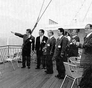 ![]() 観光船「コンチェルト」を試乗するタクシー運転手ら=神戸港で |